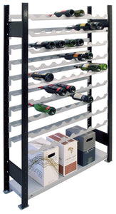 Een aantrekkelijke wijnfles opslageenheid geconstrueerd met gemakkelijk geassembleerde stalen componenten, met behulp van alle zwarte afgewerkte verticale rekkenpalen met een zilver gecoate verfafwerking op de flesinzetstukken en opslagplank. Geschikt voor zowel commerciële of binnenlandse opslag van wijn en andere gebottelde drankjes.